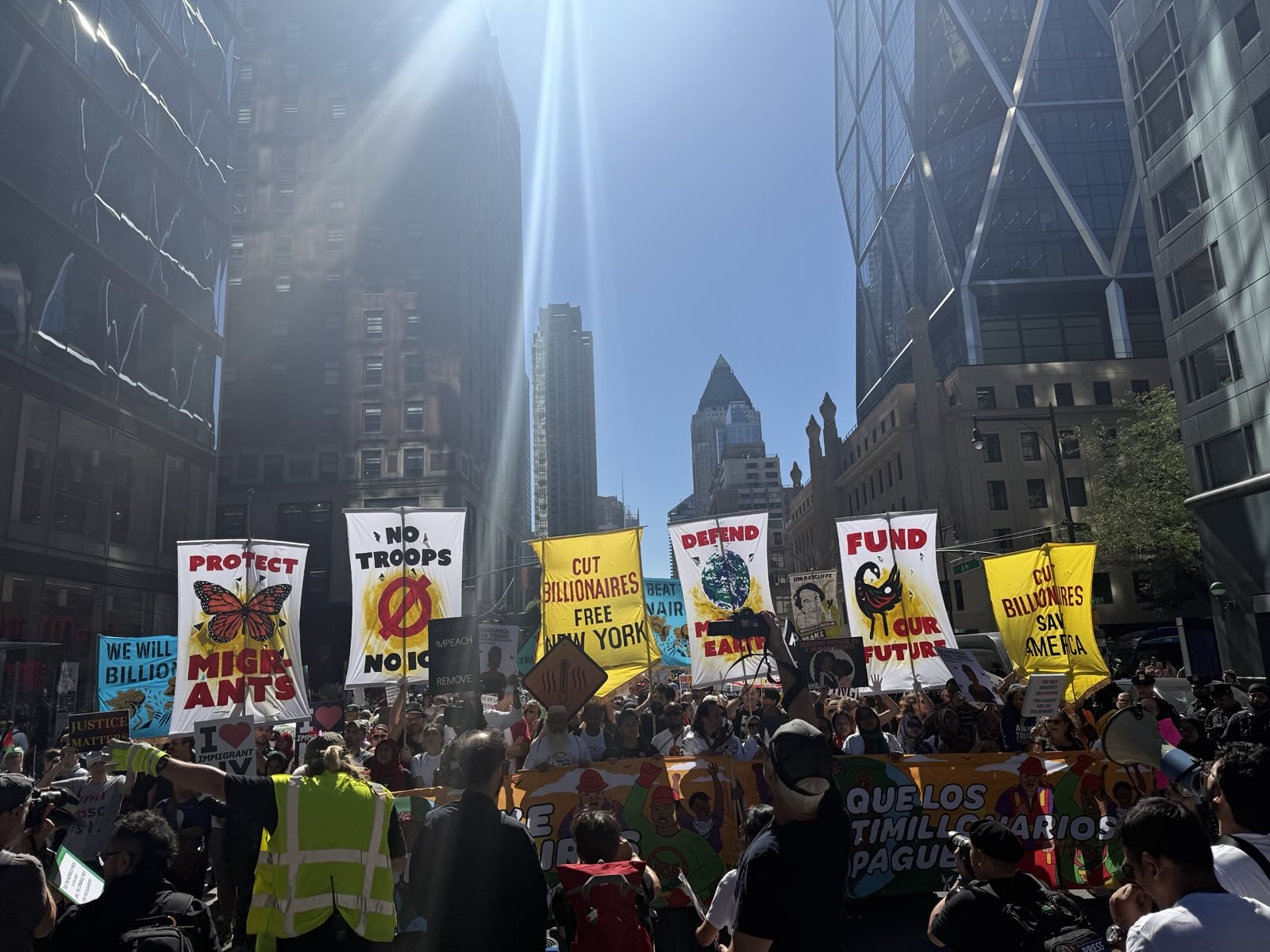 न्यू योर्क। राष्ट्रसङ्घीय ‘क्लाइमेट विक’ को उद्घाटनसँगै आज म्यानह्याटनमा ‘मेक बिलियनियर्स पे’ माग सहित २५ हजारभन्दा बढी प्रदर्शनकारीले र्याली निकाले। र्याली मिड टाउन हुँदै 'बिलियनियर्स रो' पार गरेर ट्रम्प होटल, ब्ल्याक रक र पार्क एभेन्यु पेन्टहाउस अगाडि पुगेको थियो।