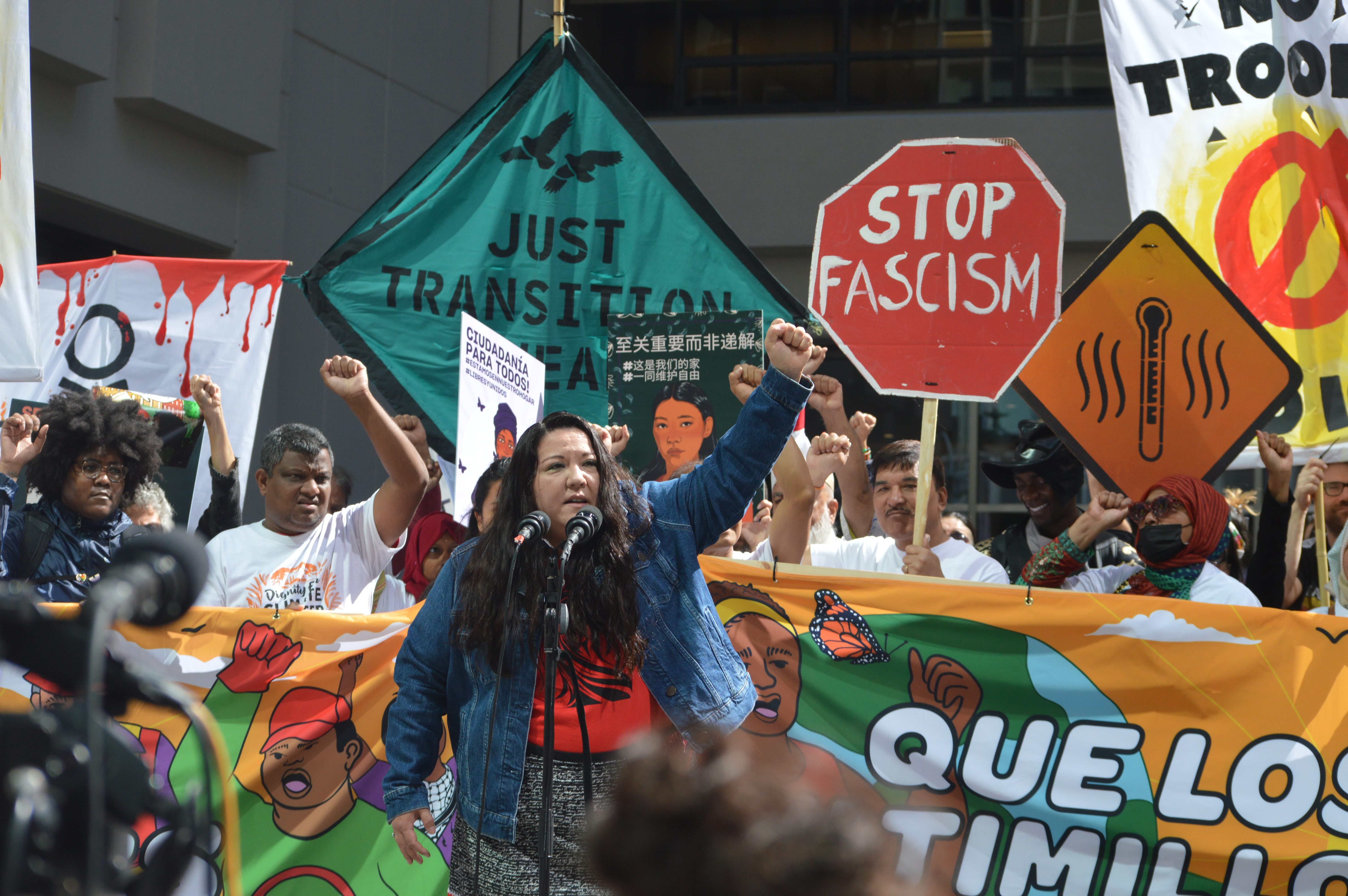 ड्रम (देसिस राइजिङ अप एन्ड मूभिङ) की अर्गनाइजिङ डाइरेक्टर काजी फौजियाले आप्रवासी समुदायमाथिको असर उजागर गर्दै भनिन्, ‘हामी विस्थापित कामदार आप्रवासीहरू गृहदेश र अमेरिकामा दुवै फ्रन्टलाइनमा मार खाइरहेका छौँ।’ उनले अर्बपतिहरुले जलवायु अराजकता बढाएको , हाम्रो भूमि र पानी दूषित पारेको, र परिवार छुट्याउने डिटेन्सन र सैन्यीकरणबाट नाफा कमाएको उल्लेख गर्दै भनिन, ‘हामी धेरै छौँ, अर्बपतिहरू थोरै छन्। हामी सम्मान र मानवीय व्यवहारका लड्ने छौँ।’