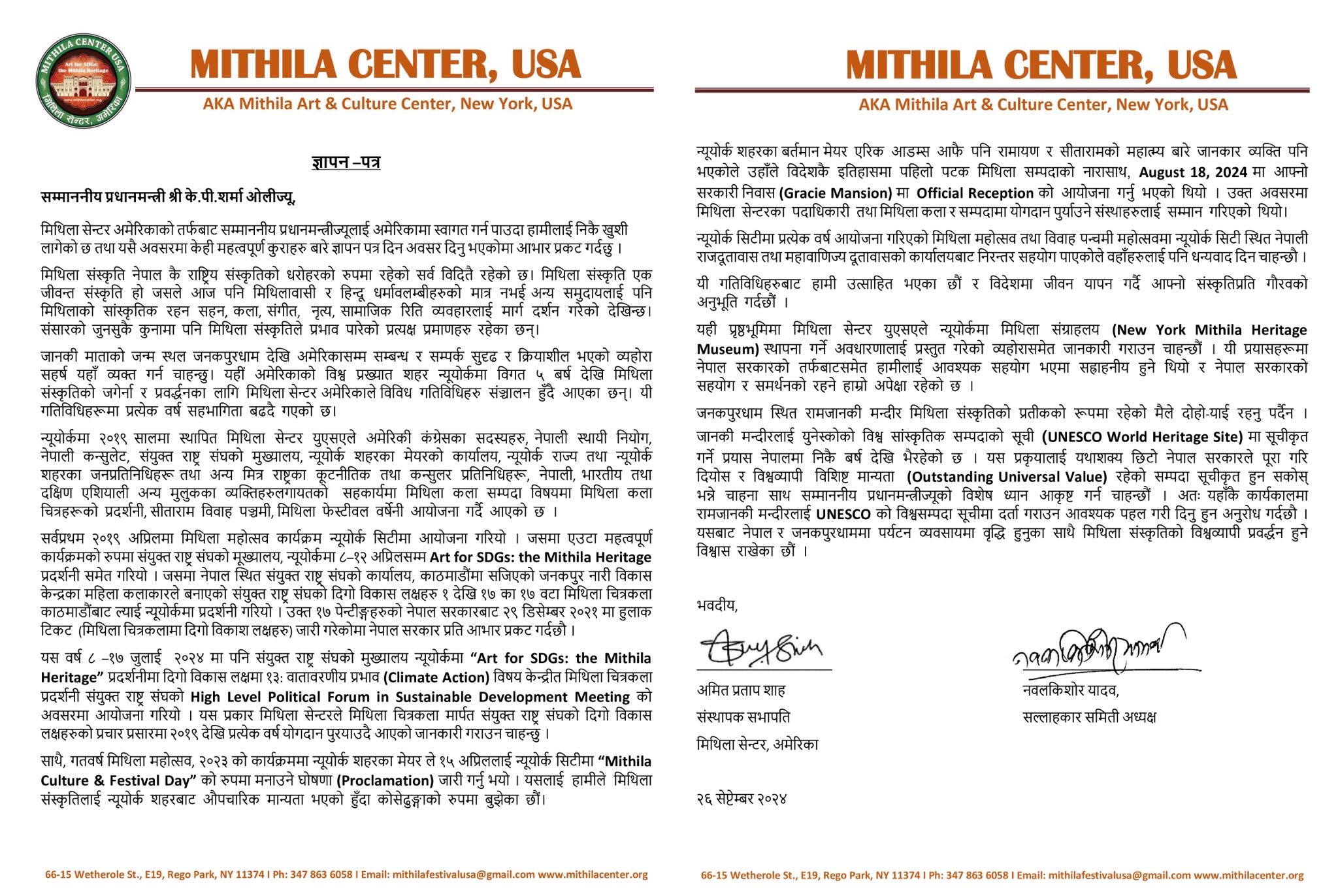 मिथिला सेन्टर युएसएले राम जानकी मन्दिरलाई युनेस्कोको विश्व सम्पदा सूचीमा दर्ता गराउन पहल गर्नका लागि प्रधानमन्त्री केपी शर्मा ओलीलाई ज्ञापन-पत्र बुझाएका छन्। संयुक्त राष्ट्र संघको ७९ औं महासभामा भाग लिन न्यू योर्कमा आउनुभएका प्रधानमन्त्री केपी शर्मा ओलीलाई भेटेर ज्ञापन-पत्र मार्फत बुझाएको मिथिला सेन्टर युएसएका अध्यक्ष अमित प्रताप शाहले जानकारी दिए। मिथिला सेन्टर युएसएले बुझाएको ज्ञापन-पत्र जस्ताको तस्तै राखिएको छ।