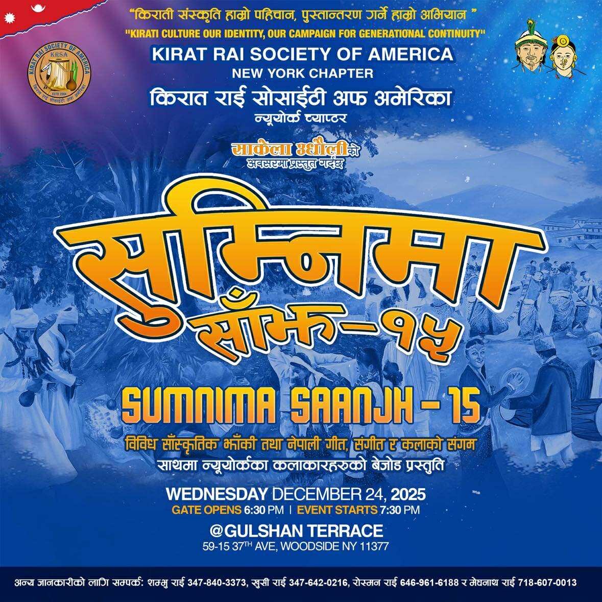 न्यूयोर्क। किरात राई सोसाइटी अफ अमेरिका (केआरएसए) न्यूयोर्क च्याप्टरले आफ्नो वार्षिक सांस्कृतिक कार्यक्रम ‘सुम्निमा साँझ–१५’ यही डिसेम्बर २४ (क्रिसमस इभ) मा आयोजना गर्ने भएको छ।
