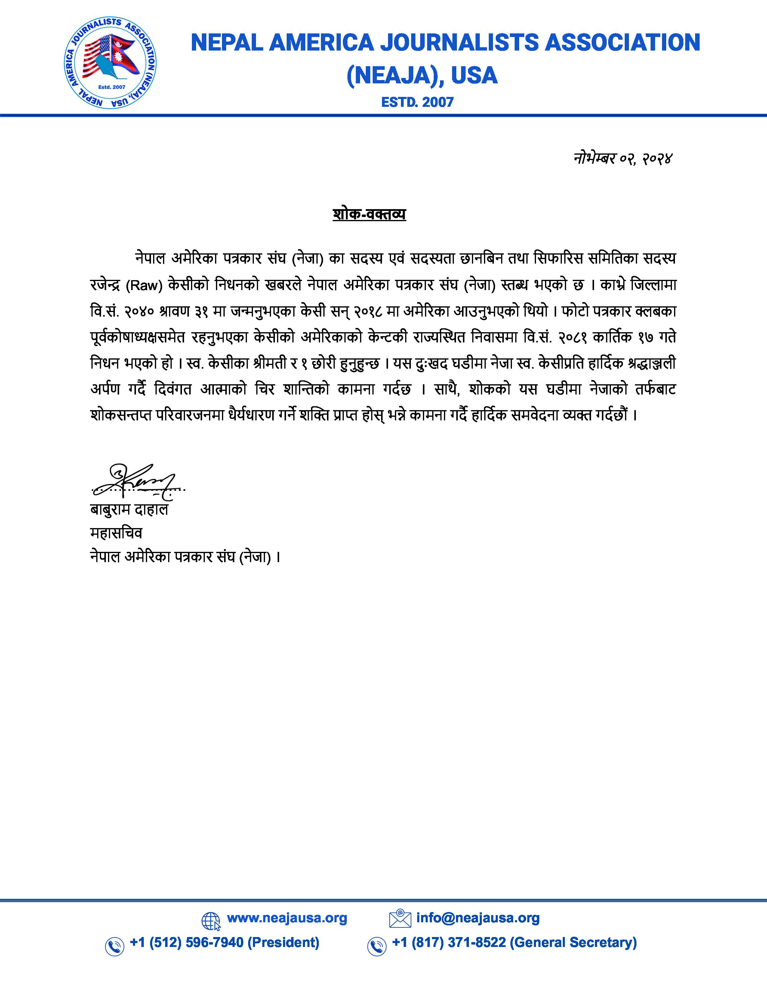 फोटो पत्रकार क्लबका पूर्वकोषाध्यक्ष केसीकोे हिजो शनिबार निधन भएको हो । क्यान्सर रोगको उपचाररत केसीको केन्टकी राज्यस्थित निवासमा निधन भएको हो।केसी प्राणघातक रोग मेटास्ट्याटिक म्यालिग्न्यान्ट प्यान्क्रियाटिक क्यान्सर रोगसँग जुधिरहेका थिए। काभ्रे जिल्लामा वि.सं.२०४० श्रावण ३१ मा जन्मेका केसी सन् २०१८ मा अमेरिका आएका थिए। स्व. केसीको श्रीमती र १ छोरी छन् । यसैबीच, नेपाल अमेरिका पत्रकार संघ (नेजा) ले केसीको निधनप्रति दुख व्यक्त गर्दै दिवंगत आत्माको चिर शान्तिको कामना गरेको छ। नेजाले एक विज्ञप्ती निकाल्दै शोकको दुखद घडीमा शोक सन्तप्त परिवारजनमा धैर्यधारण गर्ने शक्ति प्राप्त होस् भन्ने कामना गर्दै समवेदना व्यक्त गरेको छ। केसीको उपचारमा आर्थिक सहयोग रकम जुटाउन नेजाले केही समय अघि गो फन्ड मी अभियान चलाएको थियो।