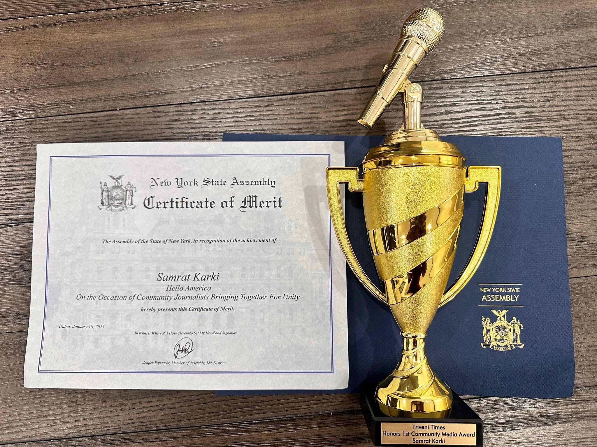 अवार्ड सँगै न्युयोर्क राज्यको एसेम्बली मेम्बर जेनिफर राजकुमारको अफिसले सम्मानपत्र प्रदान गरेको छ । कम्युनिटी मिडिया अवार्ड २०२५ पाउनेमा सम्राट कार्की हेलो अमेरिका, नेपालबाट अन्नपूर्ण मिडिया नेटवर्कका महाप्रबन्धक मनोज बस्नेत, मन्जुर हुसैन दुनिया इन्टरनेसन एण्ड ग्लोबल टिभी अमेरिका, हरप्रित सिंह तोर मेनस्ट्रीम मिडिया अमेरिका, सम्राट कार्की हेलो अमेरिका, लोबलु अन्सार बंगलादेश प्राटिशन, युई जी चाइना प्रेस, डेव ल्लावानेश जिएमए नेटवर्क अमेरिका छन् ।