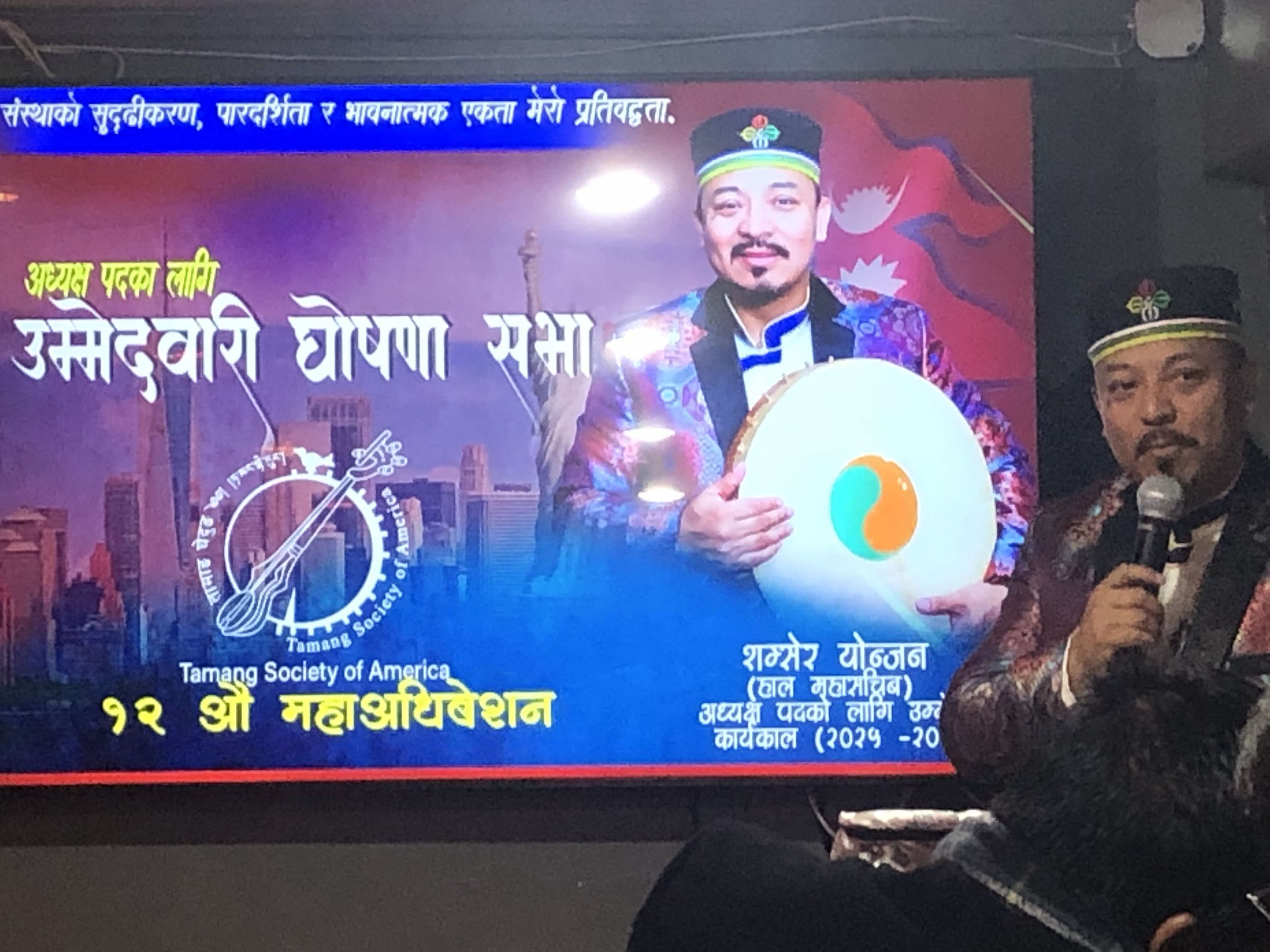 न्यू योर्क । तामाङ सोसाइटी अफ अमेरिकाको १२ औं अधिवेशन यही मार्च १६ मा न्यूयोर्कको क्वीन्समा हुने भएको छ । अधिवेशन नजिकिएसंगै सोसाइटीको भावी नेतृत्वको लागि आकाँक्षीहरुले आ आफ्नो दावी प्रस्तुत गरेका छन् । यसैक्रममा वर्तमान महासचिव सम्शेर योन्जनले भावी नेतृत्वको लागि आफ्नो उम्मेद्धारी घोषणा गरेका छन् ।