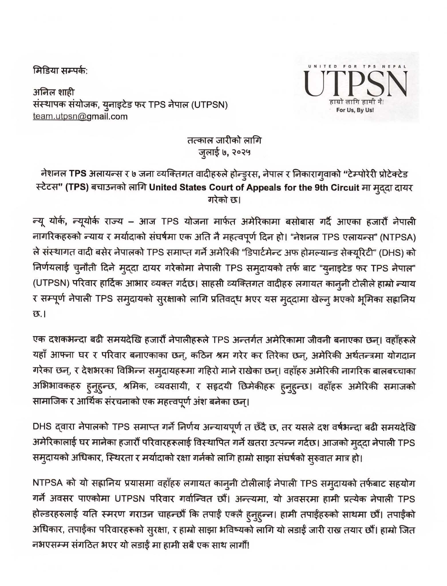युनाइटेड फर टिपिएस नेपाल (युटिपिएसएन) का संस्थापक संयोजक सदस्य अनिल शाहीले एक विज्ञप्ति जारी गर्दै सँग टिपिएसमा रहेका नेपालीहरुलाई नेश्नल टिपिएस एलायन्सको सदस्यता लिन आव्हान गरेका छन् । टिपिएस खारेजीको निर्णयले हजारौं नेपालीहरुको जीवनलाई प्रत्यक्ष असर पार्ने भएकोले टिपिएसवाहक नेपालीहरुलाई नेश्नल टिपिएस एलायन्स (एनटिपिएसए) को सदस्यता लिन आव्हान गरेको हो । अमेरिकी सरकारले मुद्धाको सुनुवाईको क्रममा वादीलाई मात्रै वा नेश्नल टिपिएस एलायन्सको सदस्यहरुलाई मात्रै कानुनी सुरक्षा प्रदान गर्न सक्ने गरी राहतलाई सिमित गर्न सक्ने सम्भावना भएकोले सबै टिपिएसवाहक नेपालीहरुलाई नेश्नल टिपिएस एलायन्स (एनटिपिएसए) को सदस्यता लिई संरक्षित हुन युटिपिएसएनले विज्ञप्तीमार्फत आव्हन गरेको हो । यो अदालतलाई अमेरिकी सरकारको आग्रह हो र मान्यो भने भन्ने सम्भावनाको लागि एनटिपिएसएको सदस्यता लिएमा नेपाली टिपिएसवाहकहरु पनि समेटिने भएकोले सदस्यता लिनु आवश्यक रहेको युटिपिएसएनको संयोजक शाहीको भनाई छ।